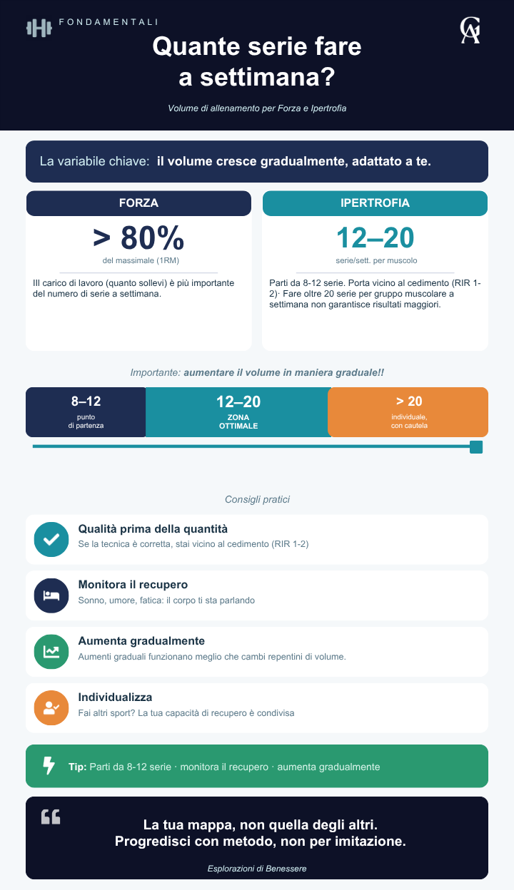 Aumenta gradualmente: se recuperi bene, aumenta gradualmente il volume di allenamento. Anche inserire una serie in più a settimana può essere una strategia, a patto che il recupero sia adeguato.