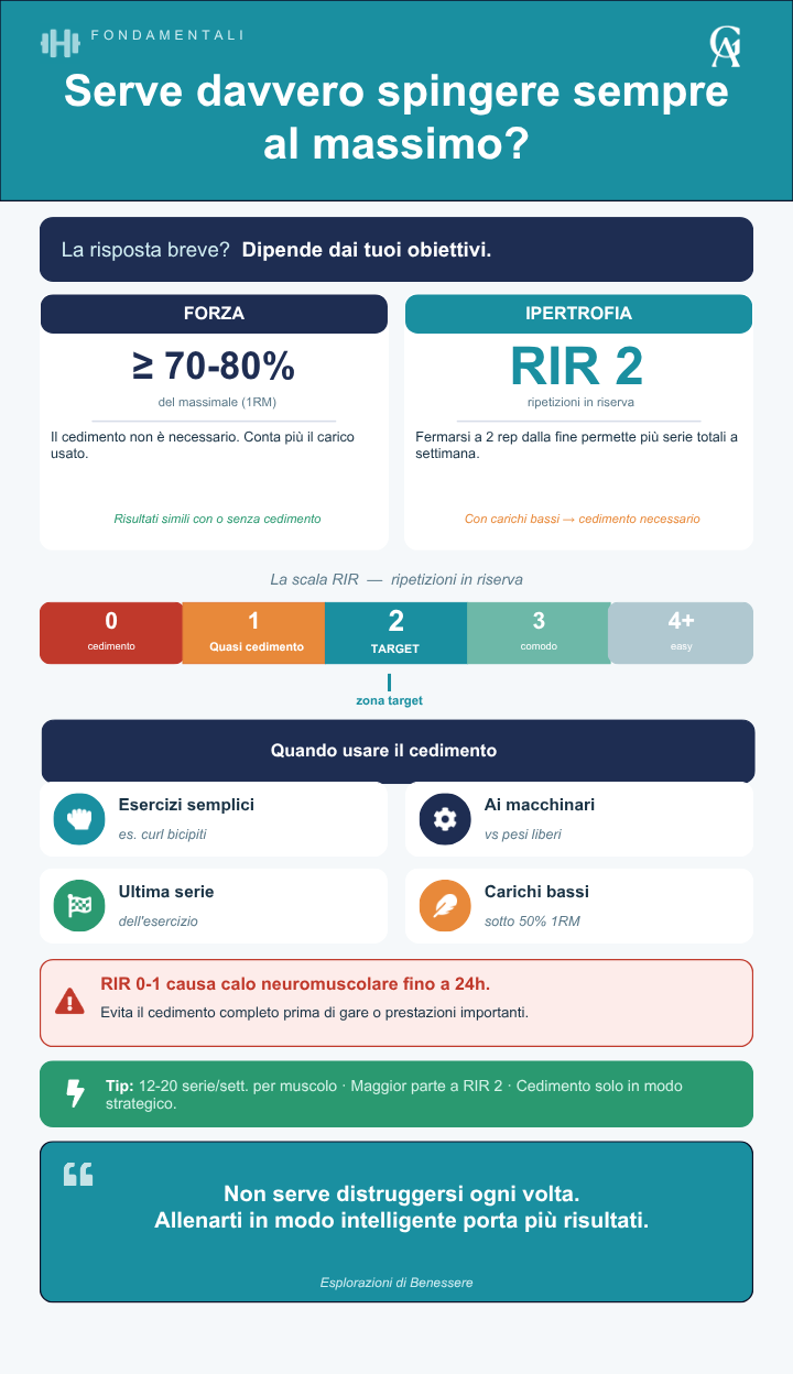 Per la forza123: gli effetti sono molto simili sia che tu arrivi al cedimento sia che ti fermi un po' prima. Quello che conta davvero è usare carichi superiori al 70-80% del tuo massimale (1RM).