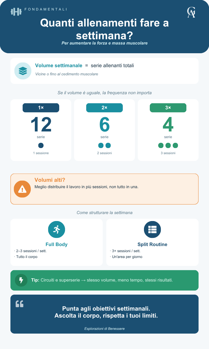 Per quanto riguarda forza e ipertrofia, non è importante il numero di allenamenti settimanali, ma il volume settimanale.1 2
