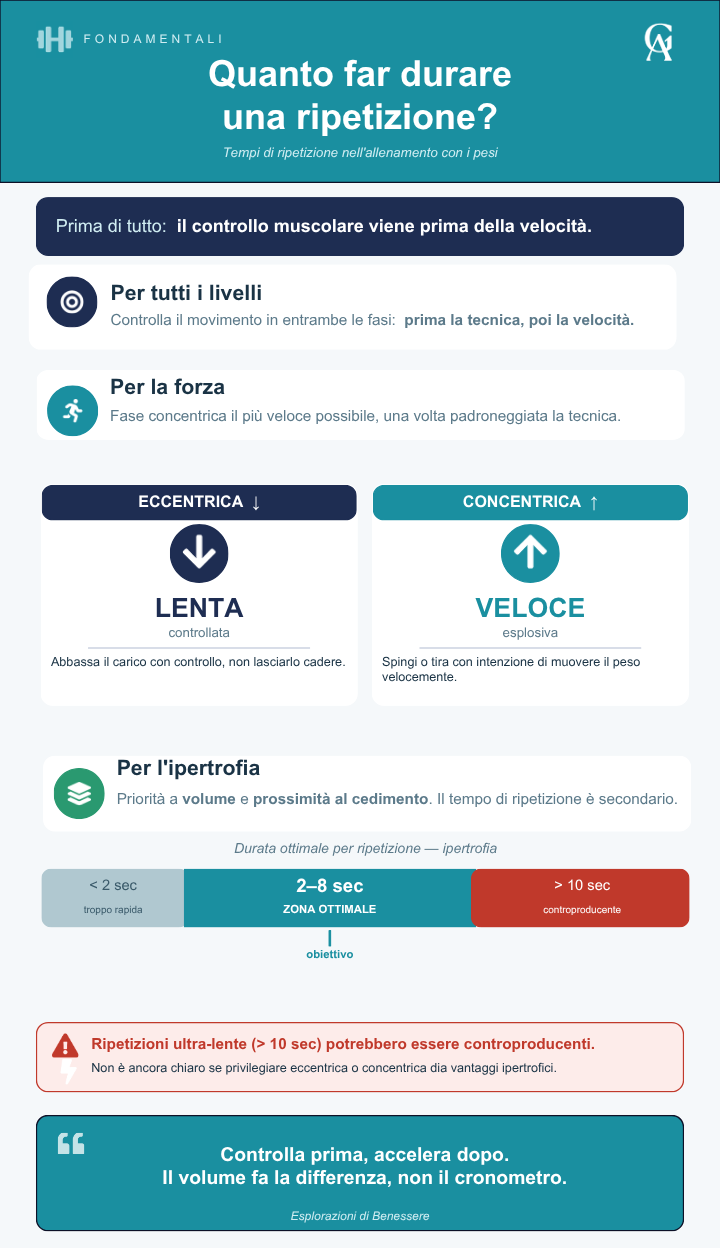 Prima di cronometrare le ripetizioni, concentrati sul controllo muscolare in entrambe le fasi. (Esempio: controlla la discesa in uno stacco da terra invece di lasciar cadere il bilanciere).